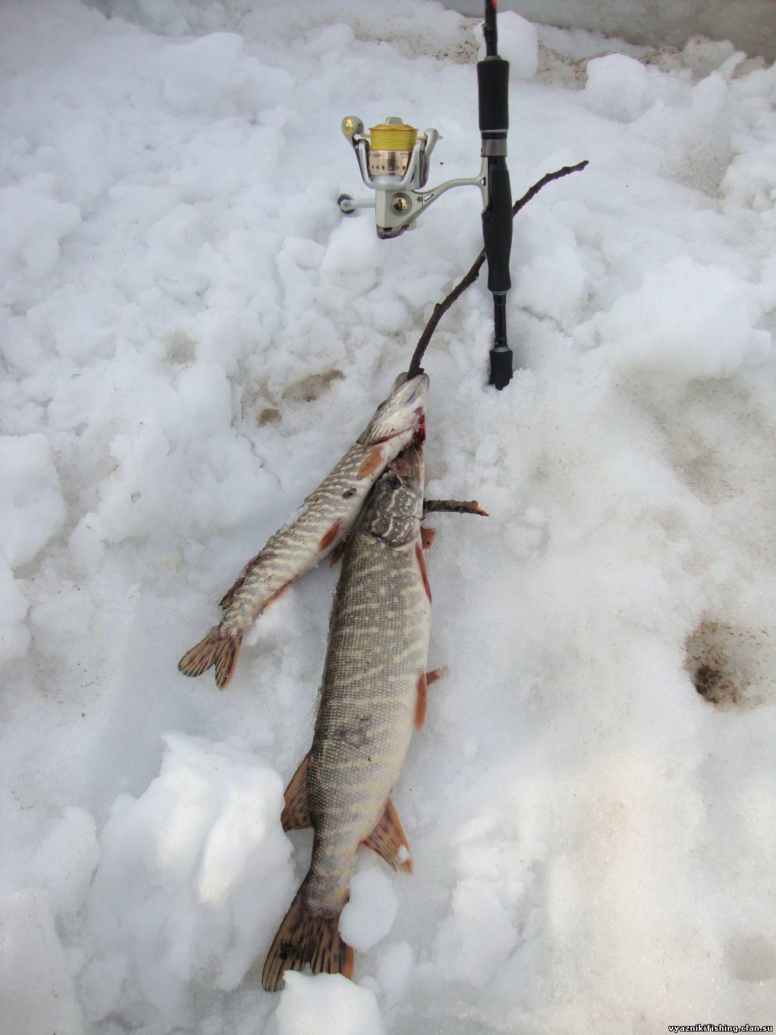 8 утра прибыл на водоём, погода плохая, то снег, то дождь, до 11 часов был такой дубак, а потом както резко потеплело и тут началось! сосед забагрил один хвост, второй, а у меня никак! поклёвки идут, но пустые и тут я решил оголить крючёк и вот на конец долгожданный щупарь, через пол часа ишо один ,но маленький! на этом я решил закончить, но оставшийся шурин сказал, что вечером начался правильный жор, а на следующий день он хапнул там хороших экземпляров-4,5 2,5 1,5кг